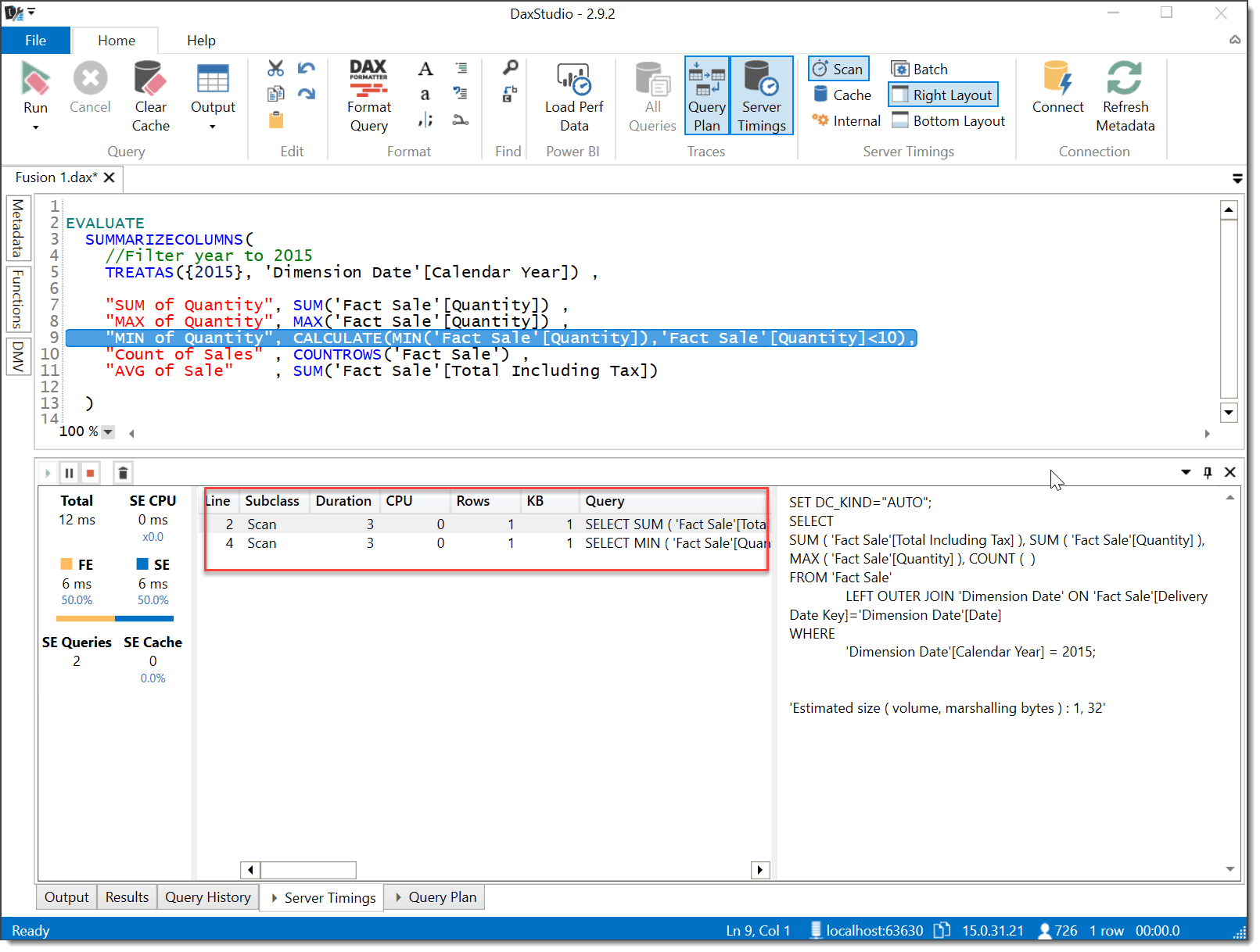 The effect of Fusion in this query is seen in the Server Timing window of DAX studio in several places.